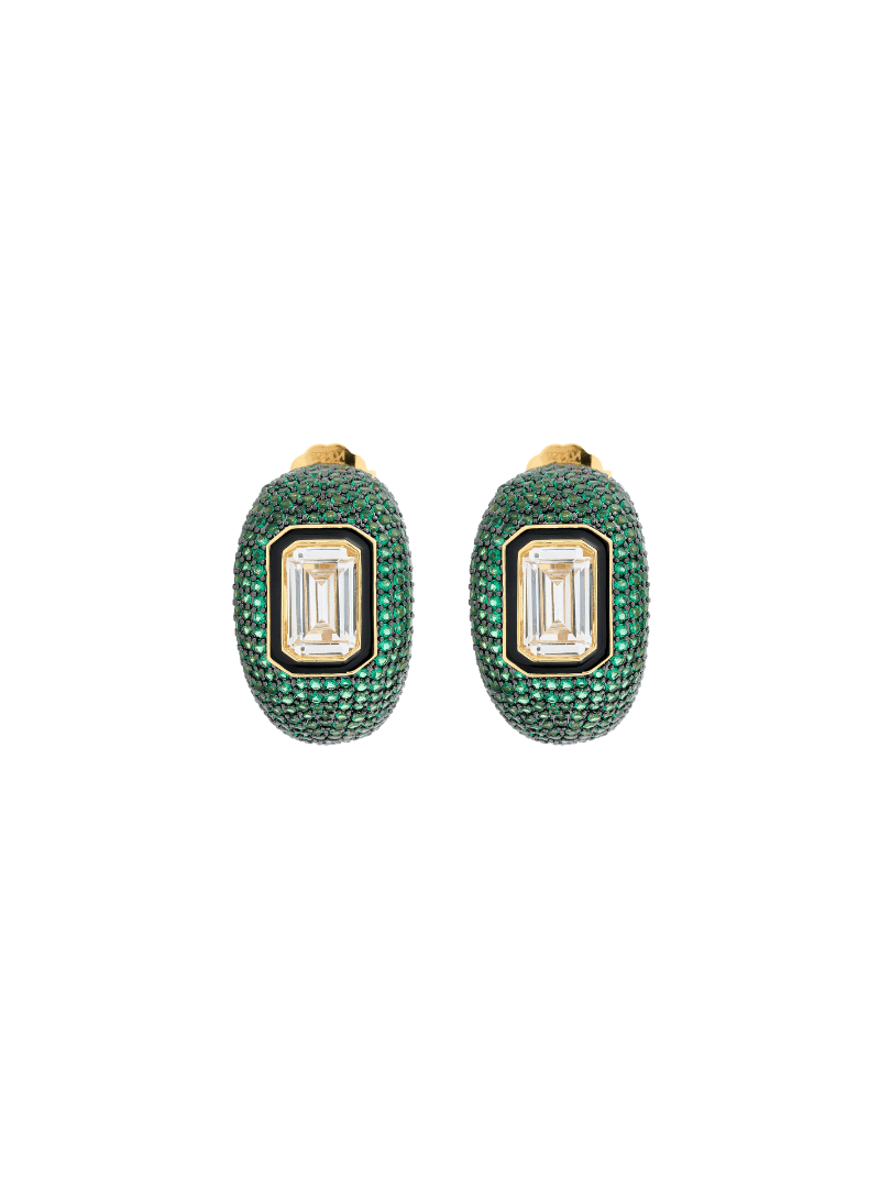 Made of bronze metal with 18-karat gold plating and black rhodium plating, and adorned with a set of paved emerald toned mycrocrystals and a faceted clear crystal framed by a black enamel octagon. 925 sterling silver pins and posts.