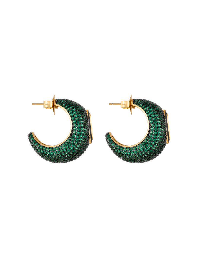The Sublime Misi Emerald Hoops are the perfect accessory to brighten up any outfit, capturing nature’s light show of a green aurora borealis with their emerald-colored microcrystal inlays that frame a central rectangular faceted crystal.