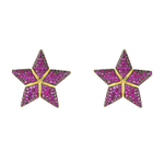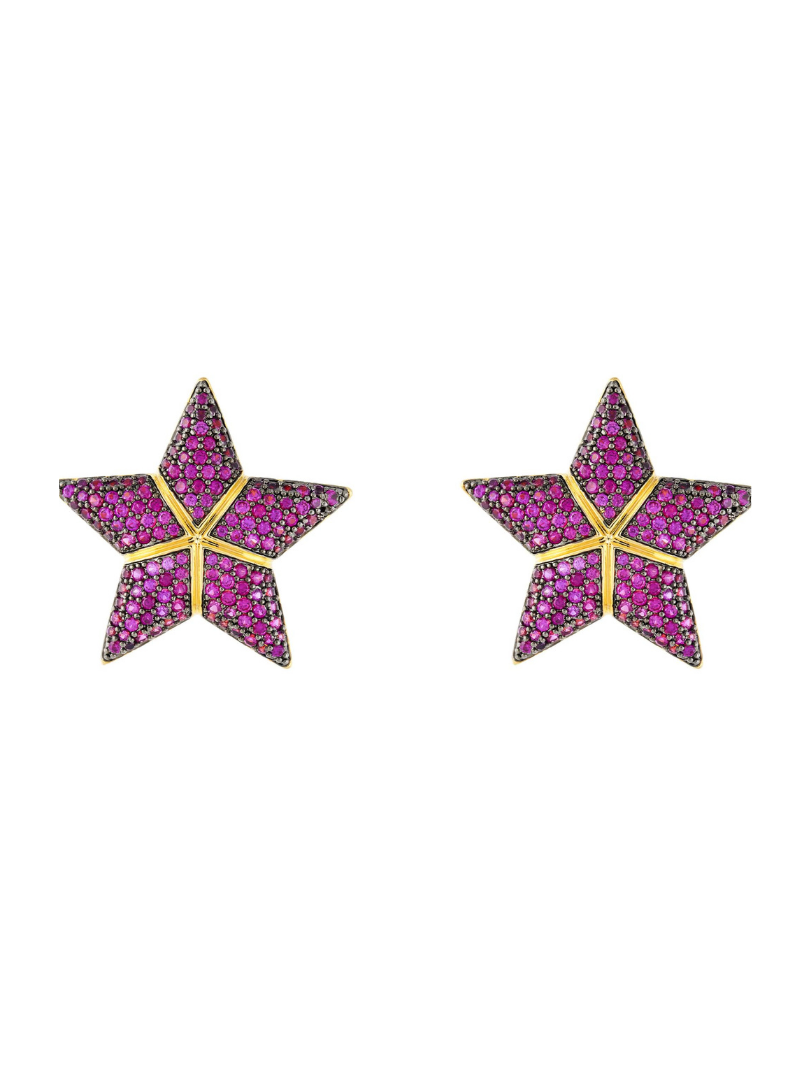 Aretes en plata ley 990 y bronce con baño de oro amarillo de 24k y baño de oro negro con incrustación de cristales color rubí.
