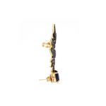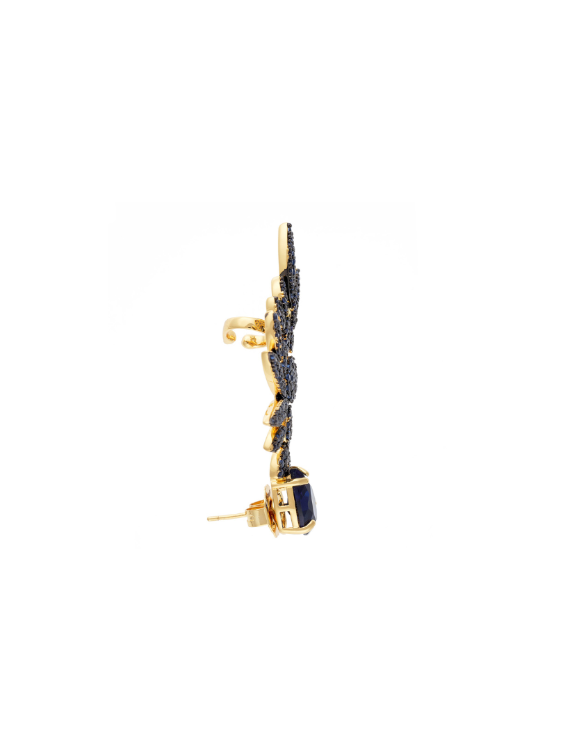 Ear cuff en metal bronce con baño de oro de 18k, baño de oro negro e incrustaciones de cristales color zafiro.