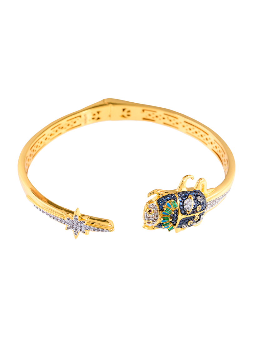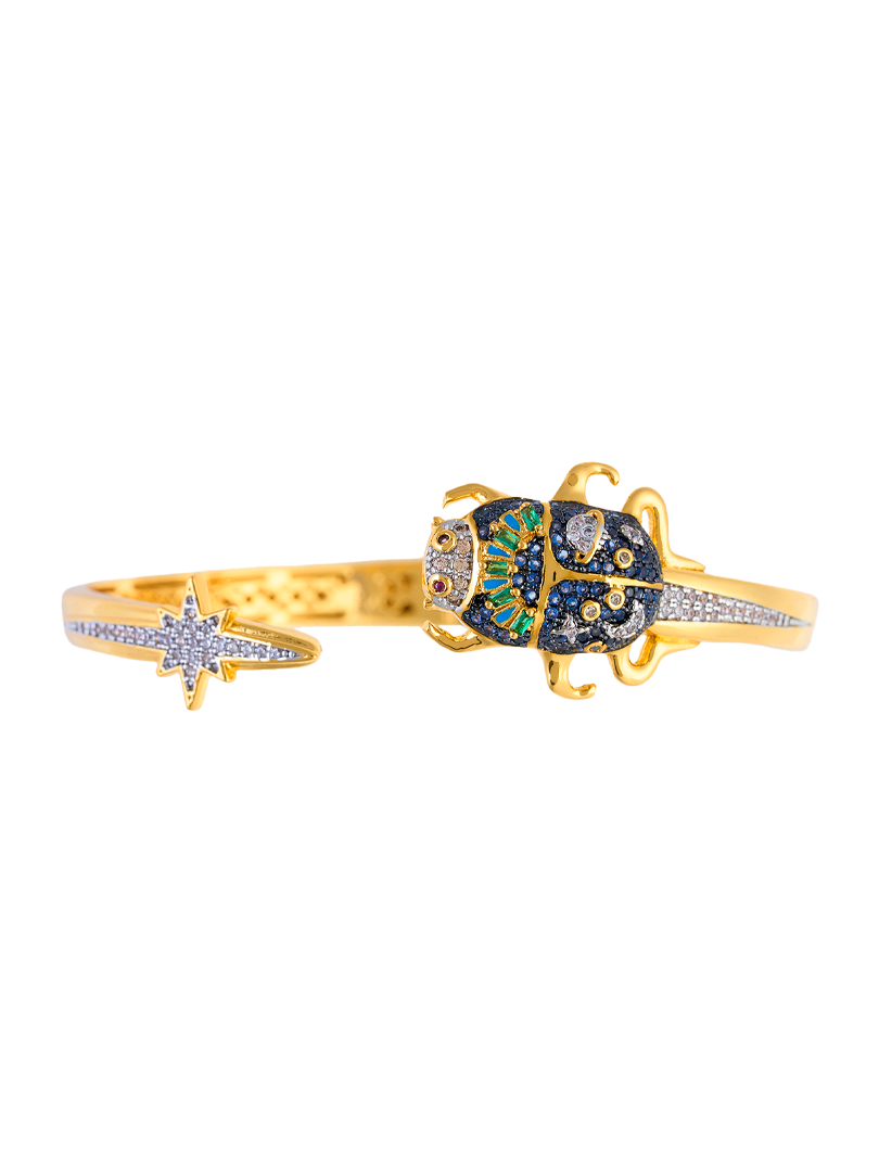 Transform your energy with the Delirio Jepri Bracelet, a tribute to the sacred scarab—a symbol of rebirth and eternal power. Made in bronze with 24K gold plating, white and black rhodium, and adorned with crystals in sapphire, crystal white, champagne, ruby, dark green baguette, and blue enamel.
