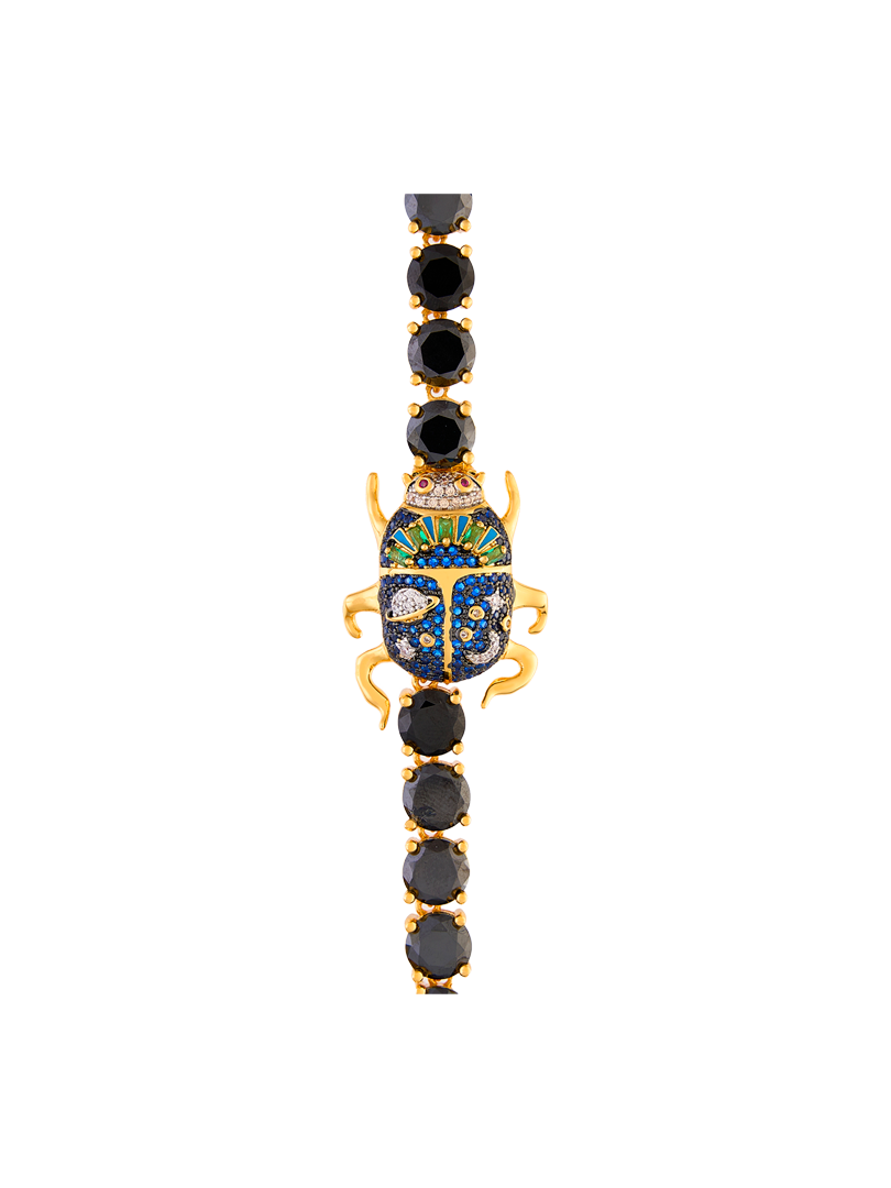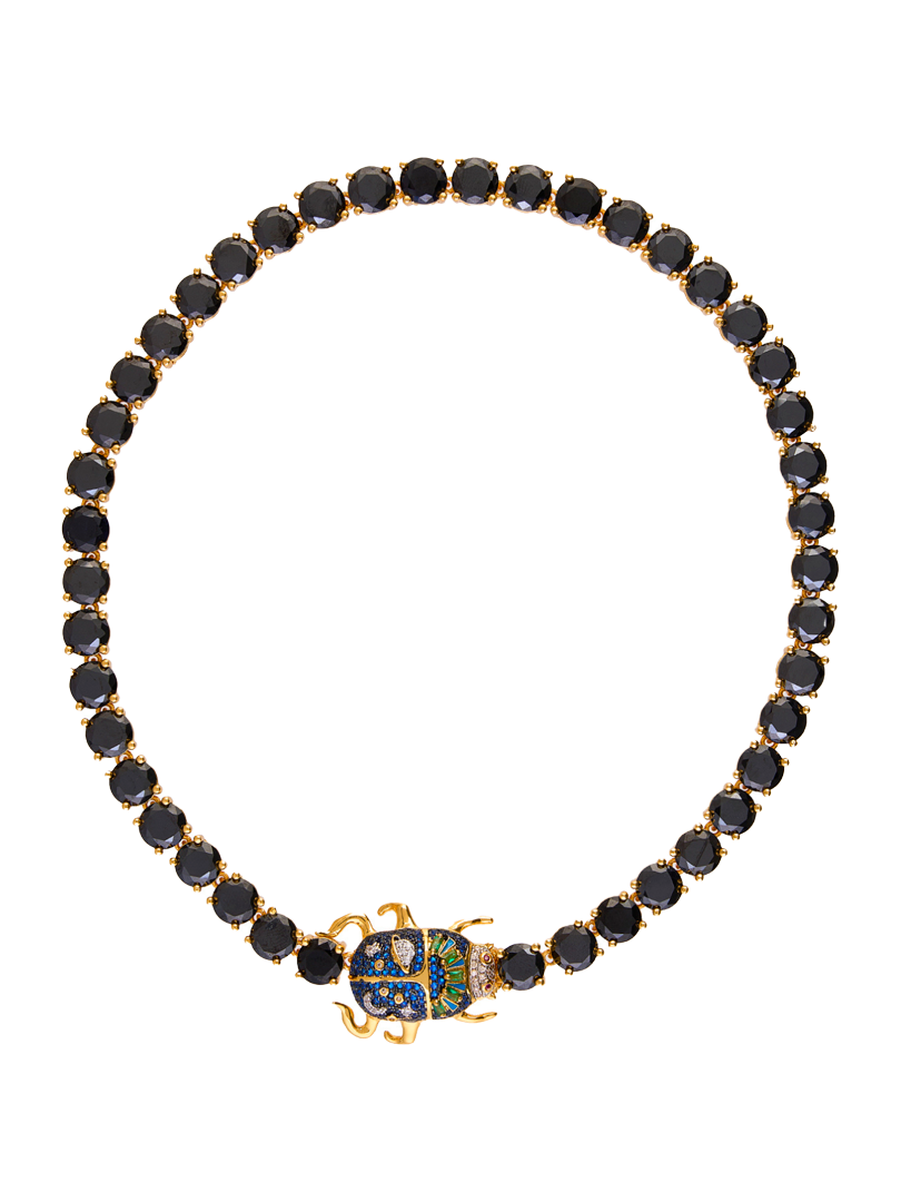 Necklace crafted in bronze with silver alloy, plated in 18K gold and black rhodium. Embellished with crystals in sapphire, crystal white, champagne, ruby, dark green, and finished with blue enamel.