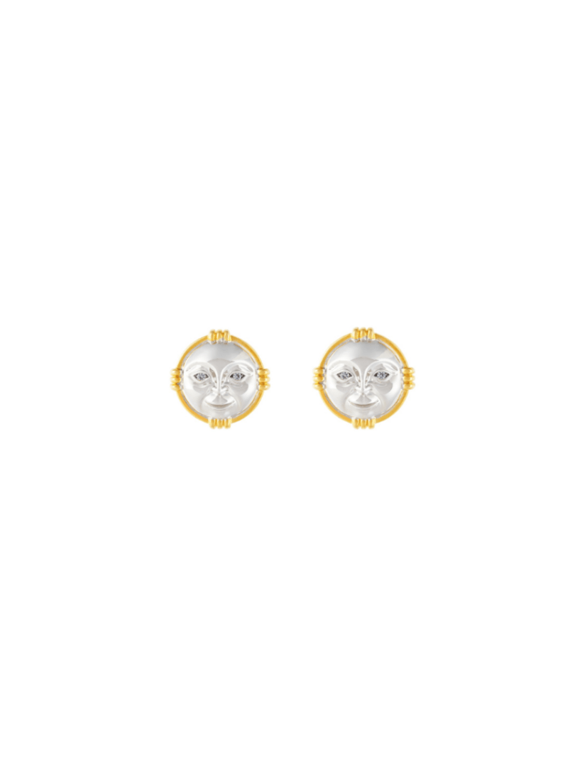 Aretes en metal bronce con baño de oro amarillo de 18k y baño de rodio e incrustación de microcristales color cristal.