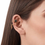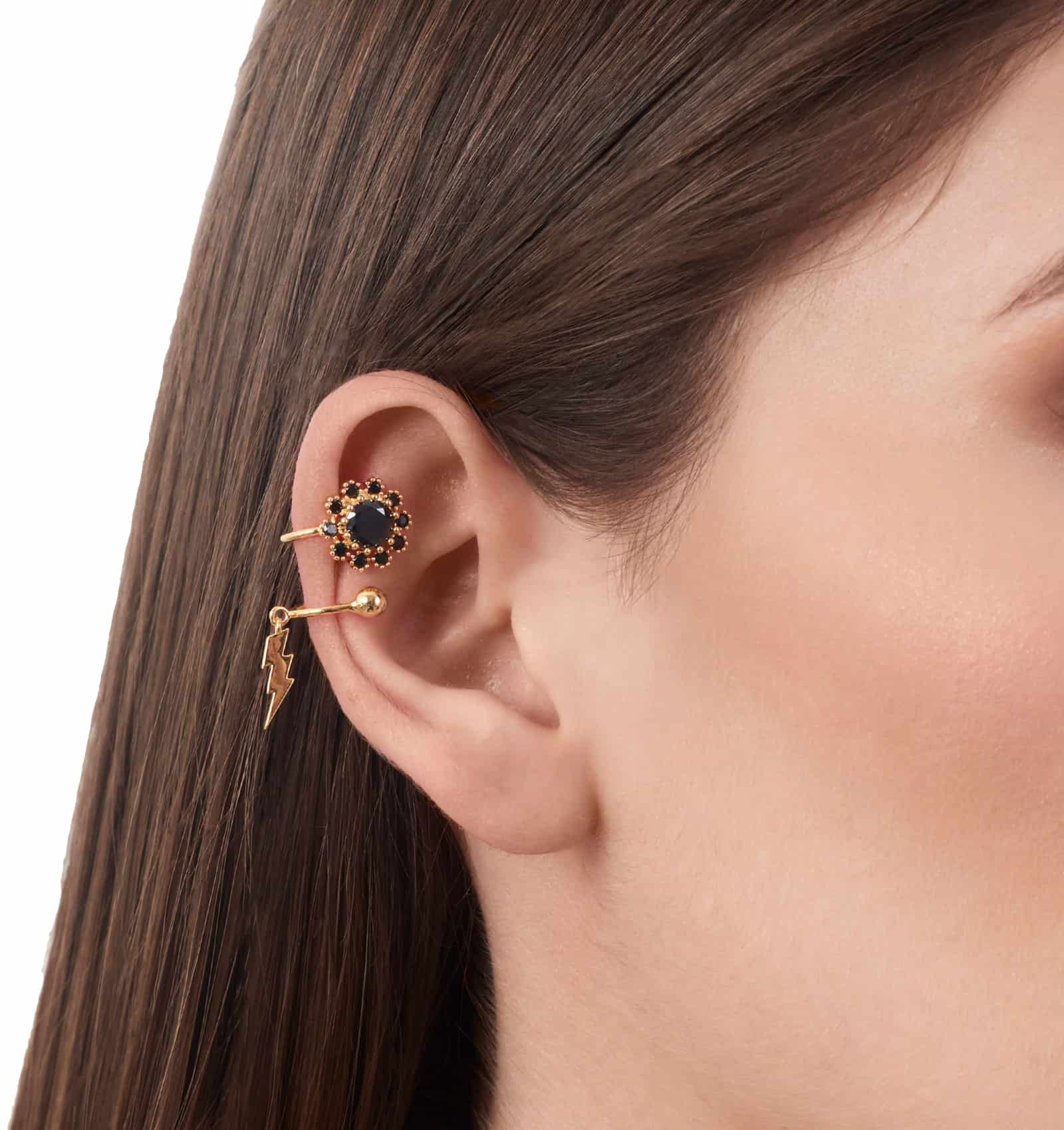Lleva el toque celestial de Alhena en tu oído, ear cuff elaborado en metal bronce con baño de oro de 24k e incrustación de cristales color negro.