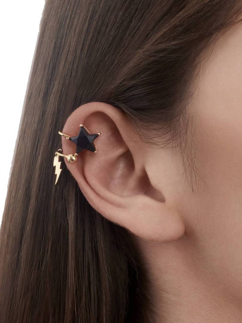 Ear cuff elaborado en metal bronce con baño de oro de 18k, baño de rodio e incrustación de cristales color onix.