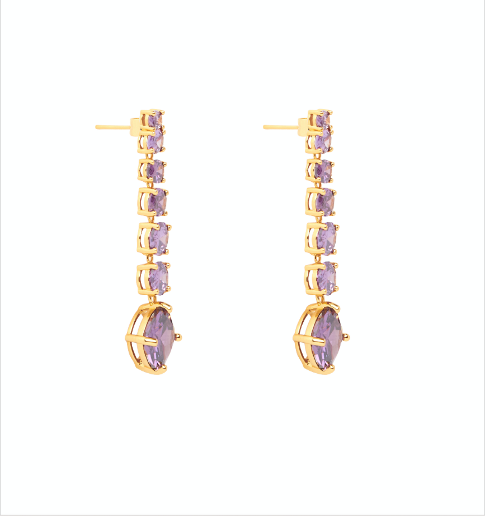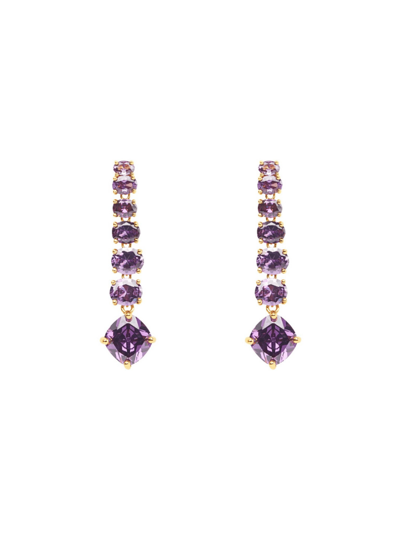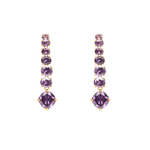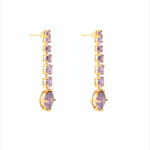 Aretes elaborados en metal bronce con baño de oro de 18K con incrustación de cristales color amatista.