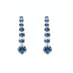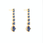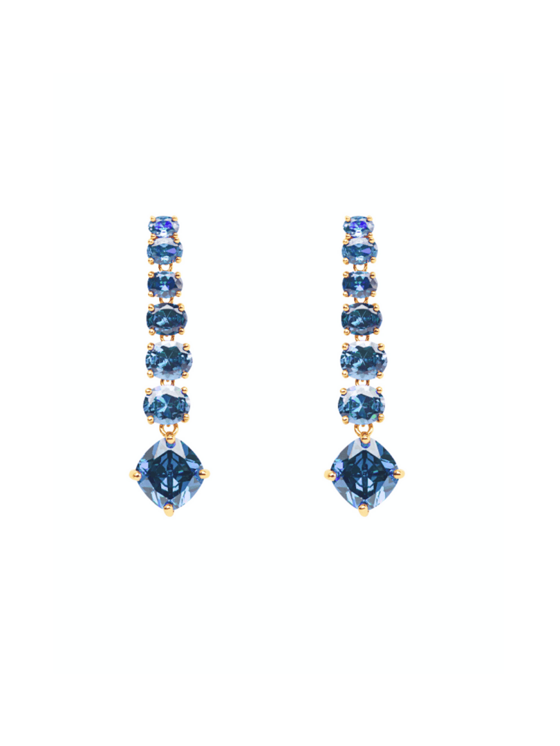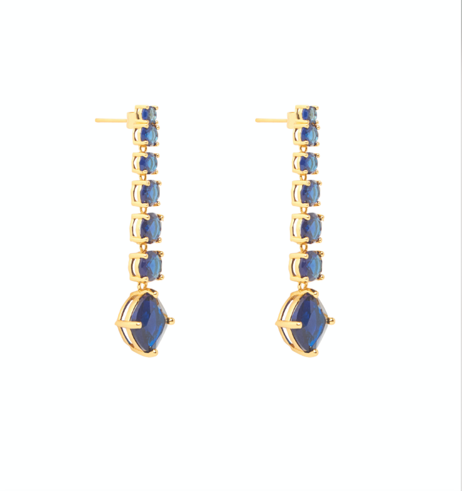 Aretes elaborados en metal bronce con baño de oro de 18K con incrustación de cristales color zafiro.