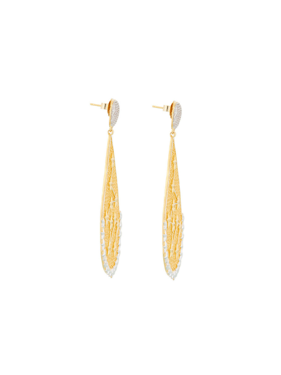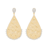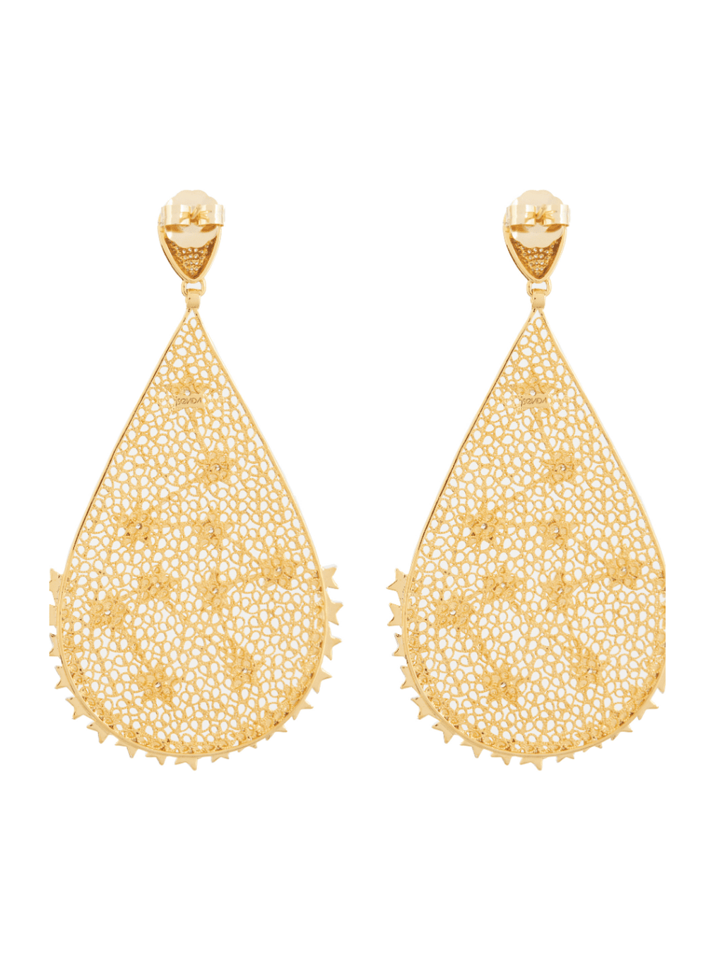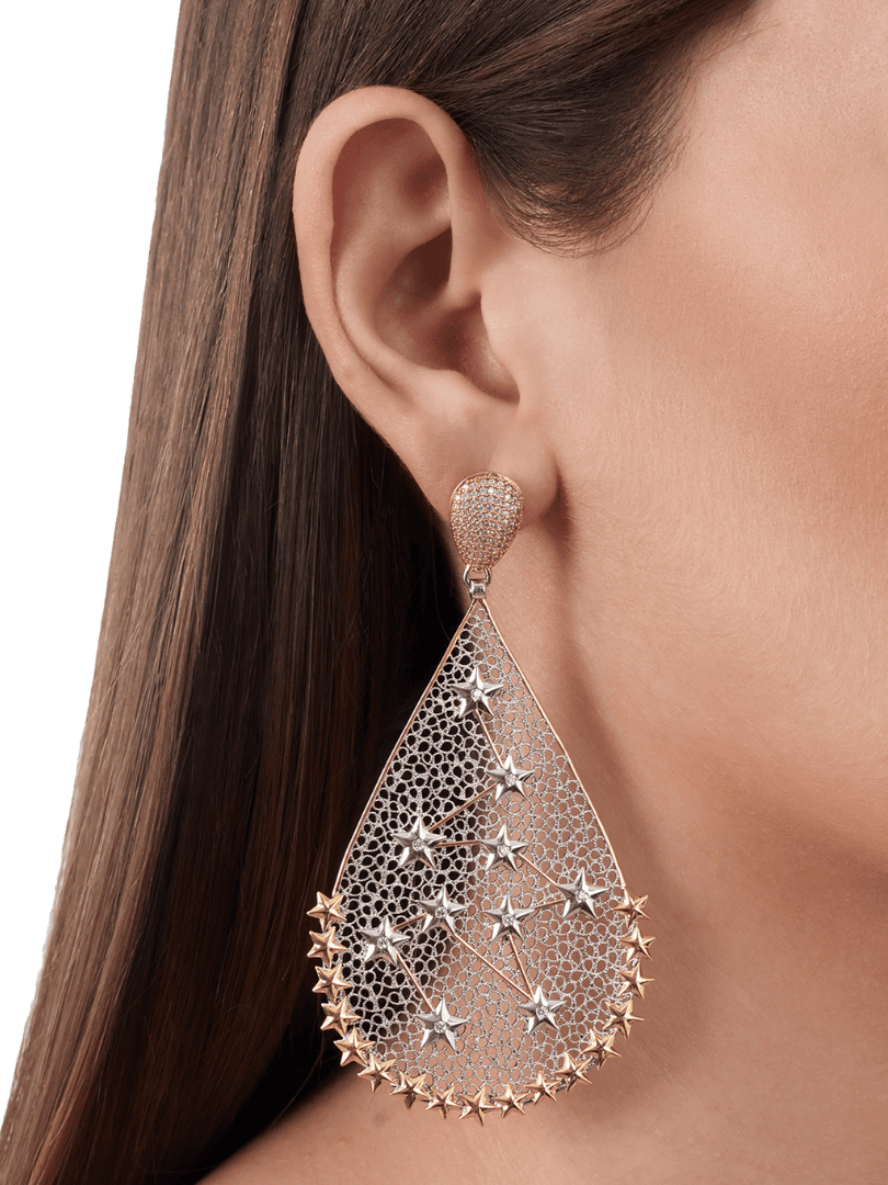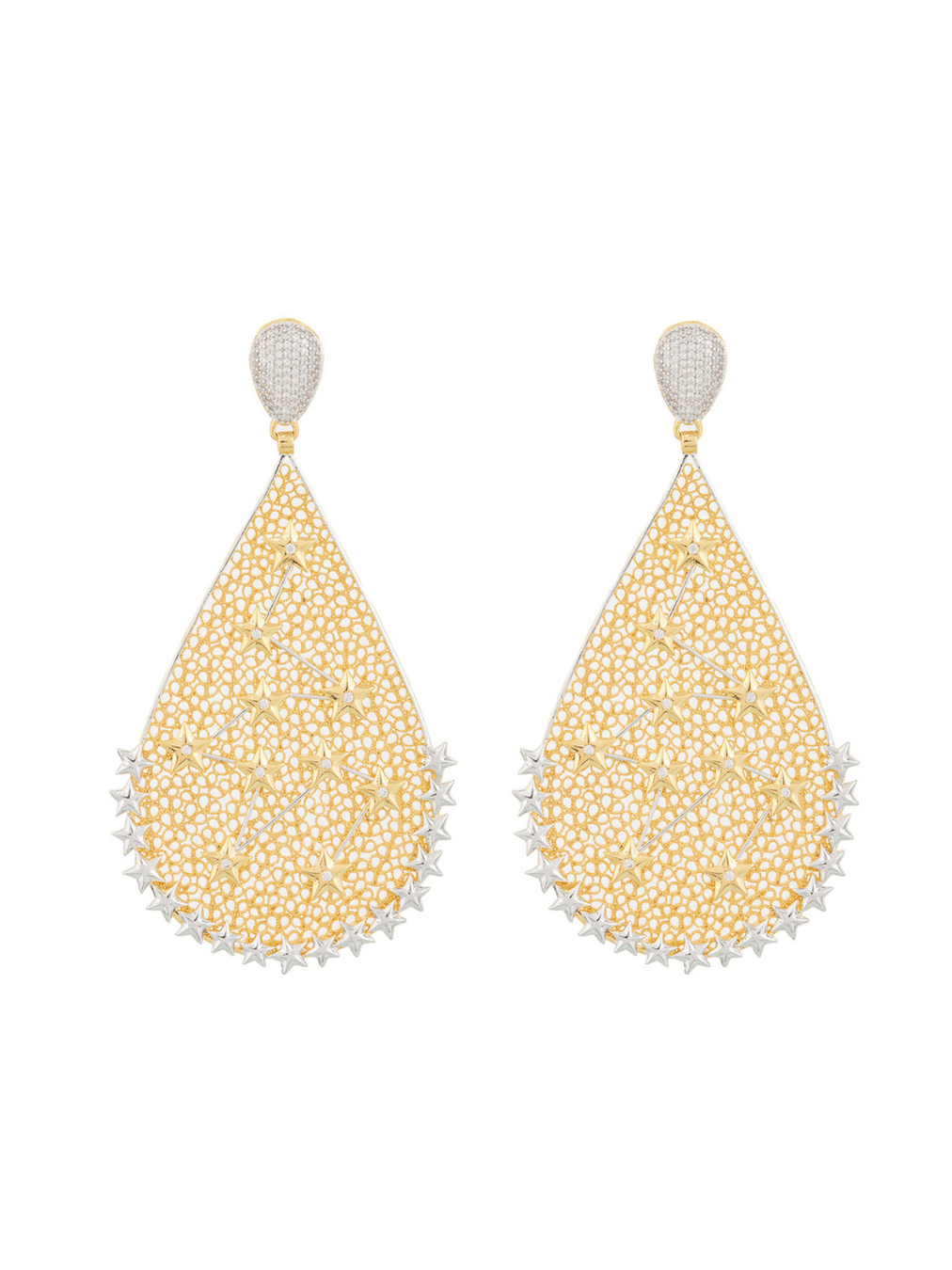 Los Aretes Gota Stardust Fiesta, un homenaje al brillo del Cosmos. Elaborados en metal bronce con baño en oro de 18k, baño de rodio e incrustación de cristales color cristal.