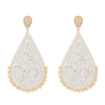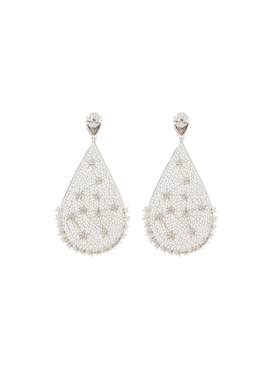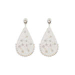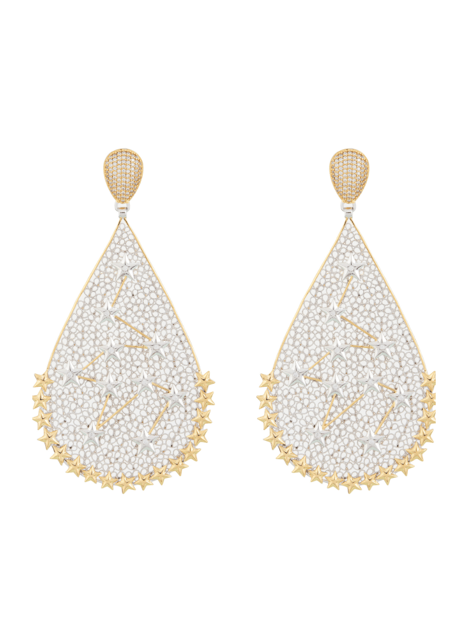 Los Aretes Gota Stardust Fiesta, un homenaje al brillo del Cosmos. Elaborados en metal bronce con baño en oro de 18k, baño de rodio e incrustación de cristales color cristal.