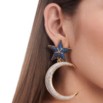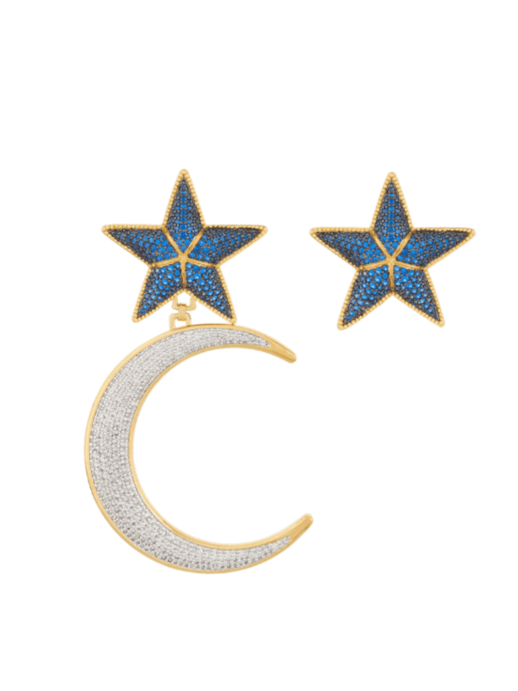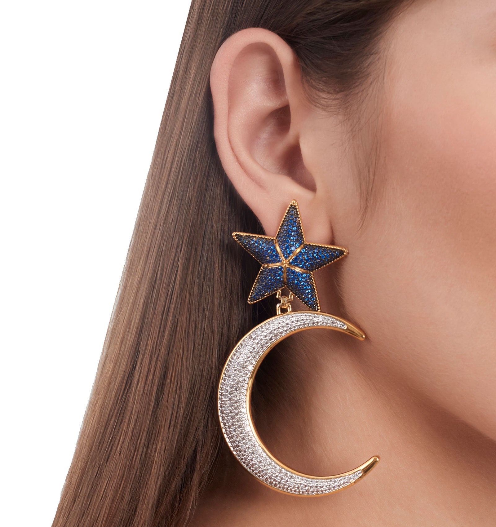 Aretes en plata de ley 990 y bronce con baño de oro de 24k, oro negro e incrustación de microcristales color cristal y zafiro.