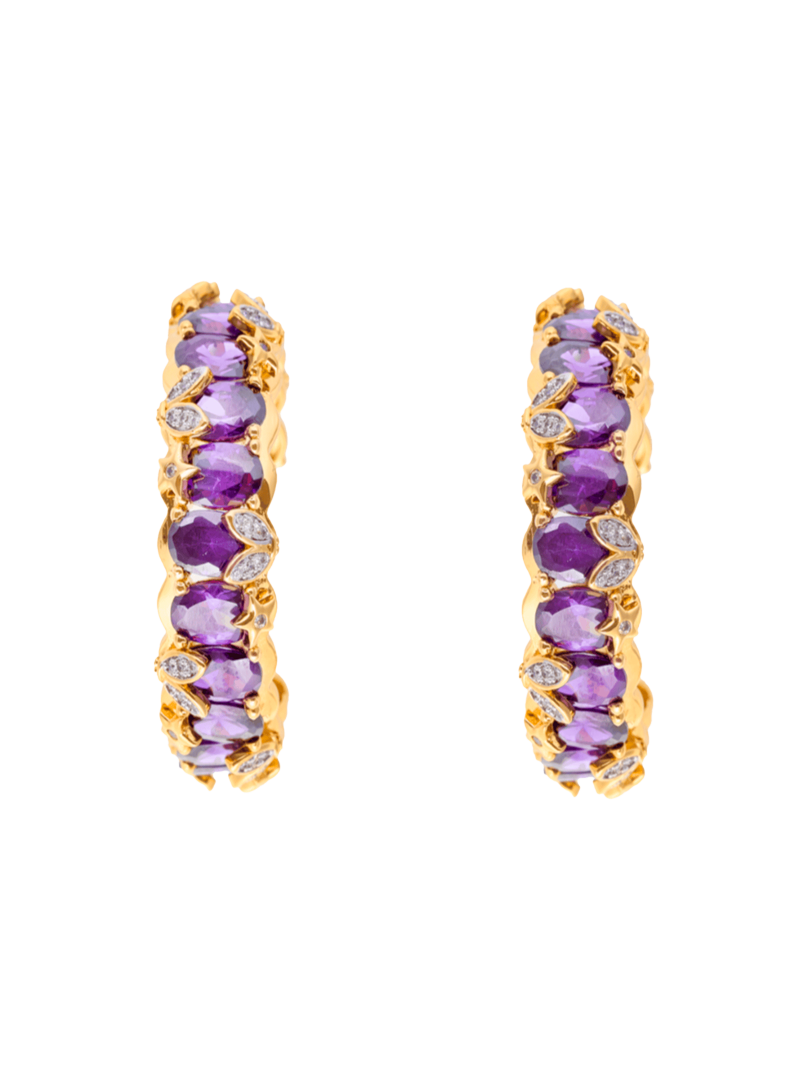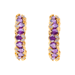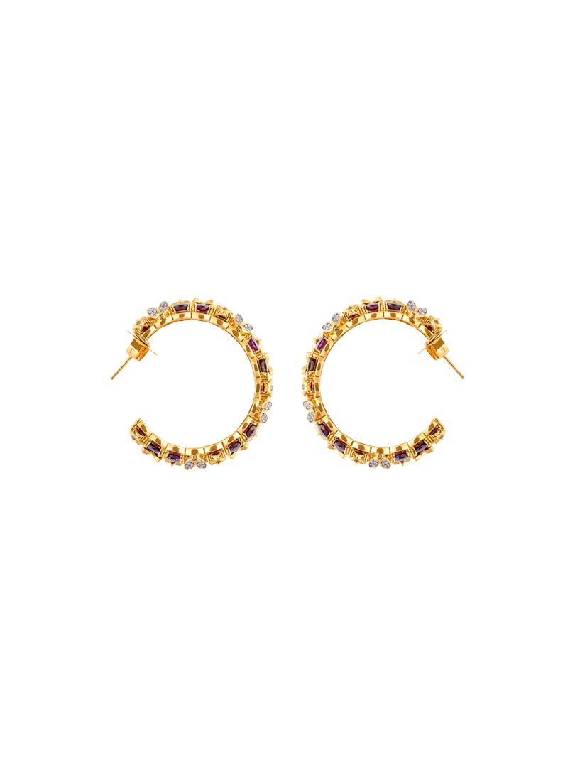 Enhance your style with the cosmic harmony and elegance of the Catarina Maat hoops, crafted in bronze with 18K gold plating and accented with white rhodium for a celestial glow. Featuring faceted amethyst and crystal cubic zirconia, they capture the mystery of the universe. Made with 925 sterling silver posts.