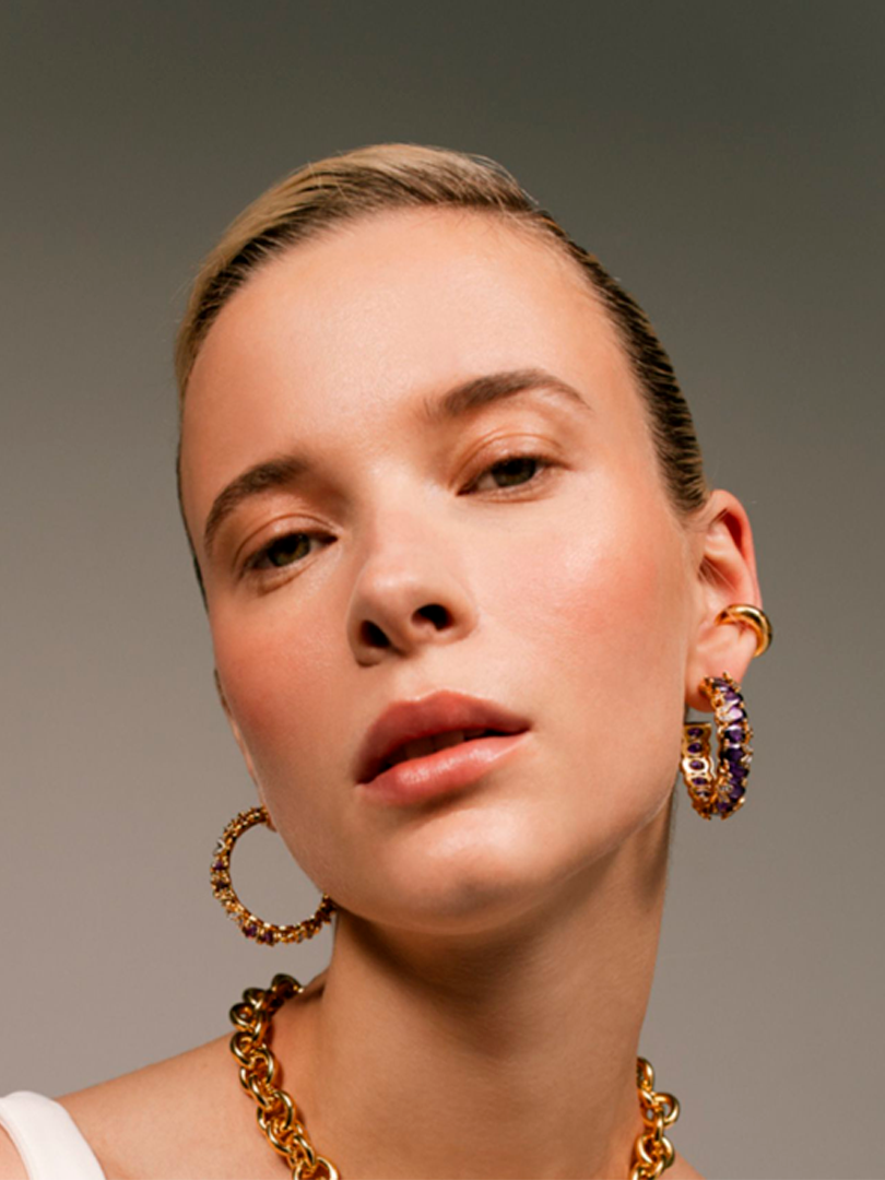 Our jewelry is made from silver and bronze, coated in 18k gold and rhodium, and adorned with natural stones, crystals, and select enamels.
