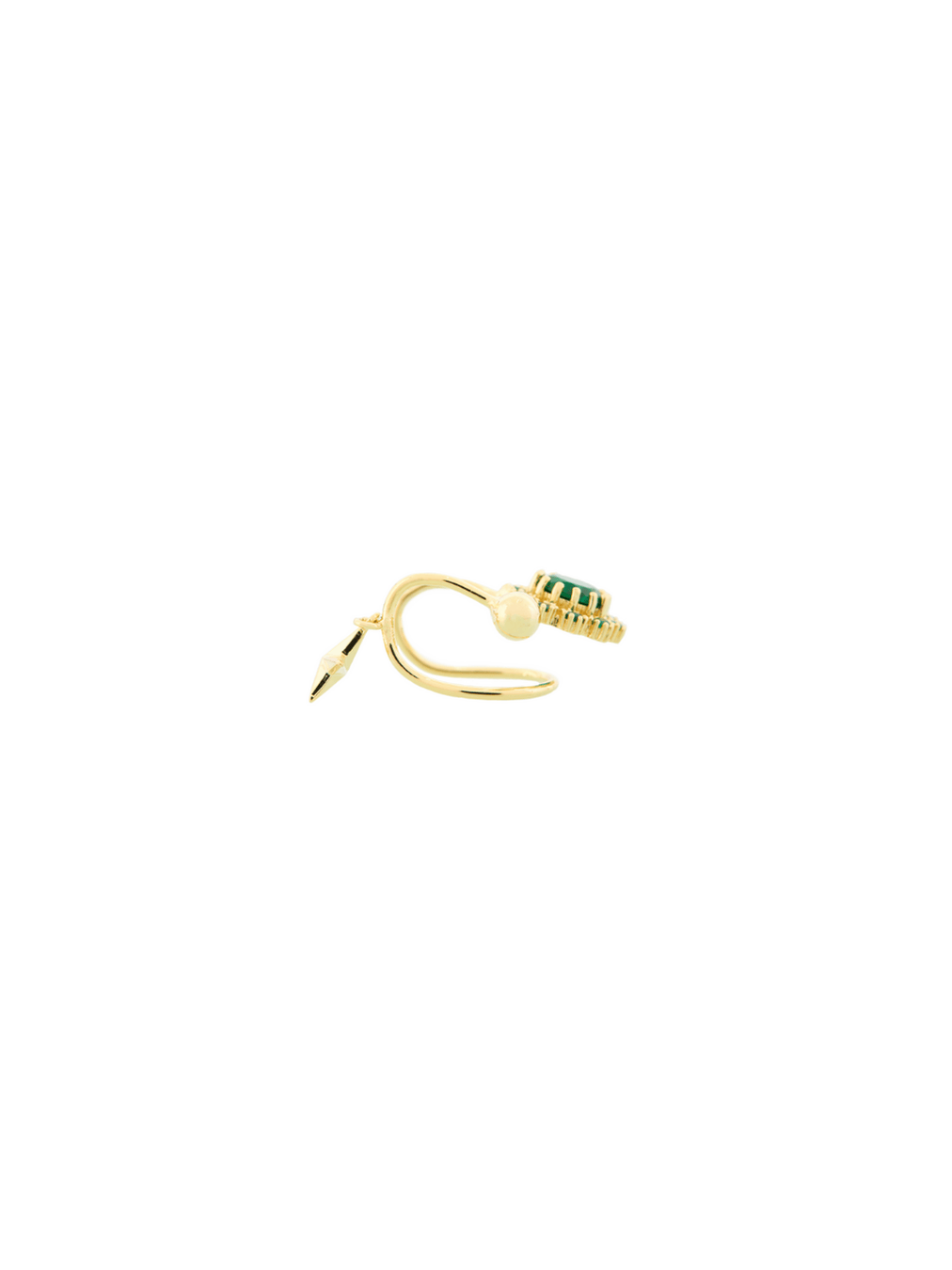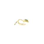 Lleva el toque celestial de Alhena en tu oído, ear cuff elaborado en metal bronce con baño de oro de 18k e incrustación de cristales color esmeralda.
