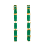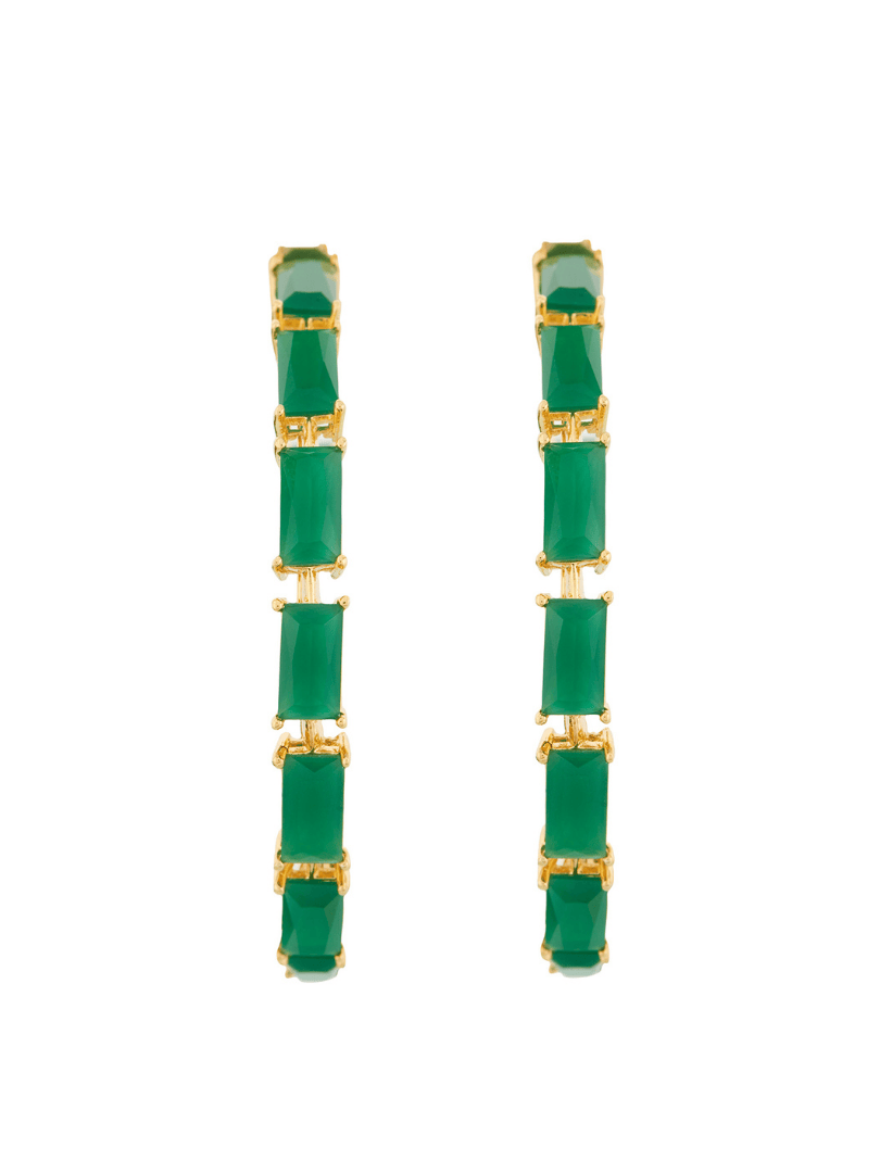 Aretes en plata ley 900 y bronce con baño de oro de 24k e incrustación de cristales baguettes color verde esmeralda opal.