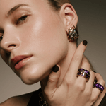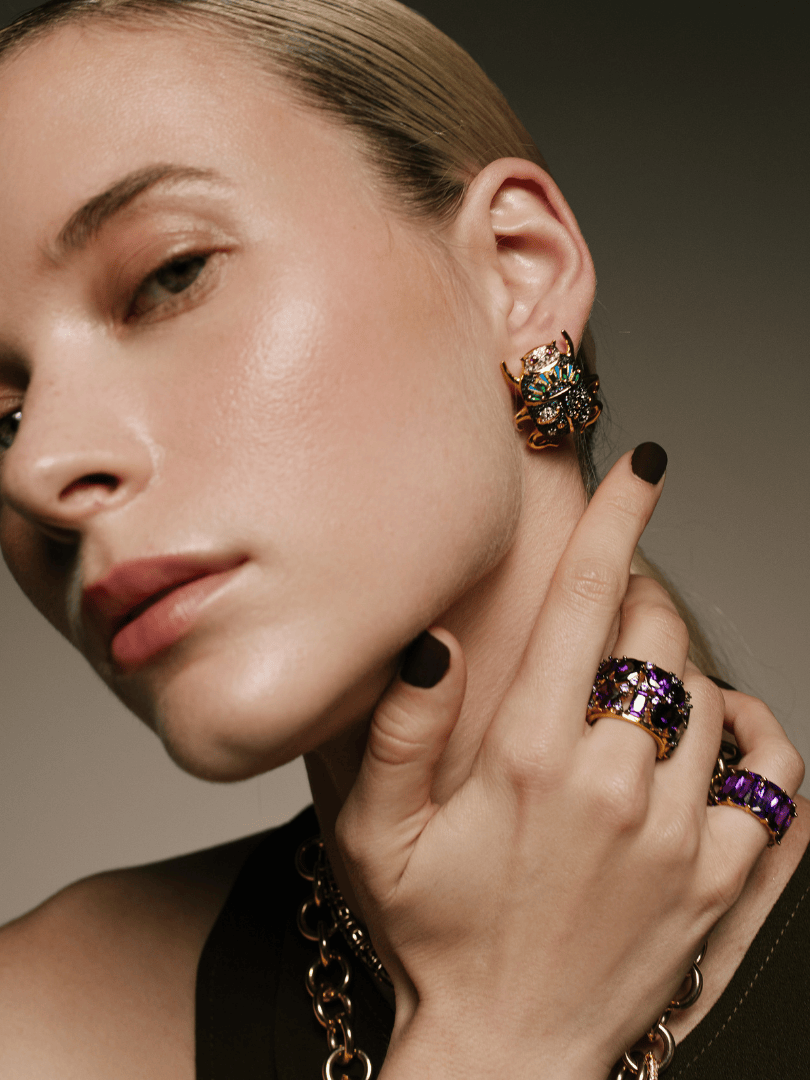 Our jewelry is made from silver and bronze, coated in 18k gold and rhodium, and adorned with natural stones, crystals, and select enamels.