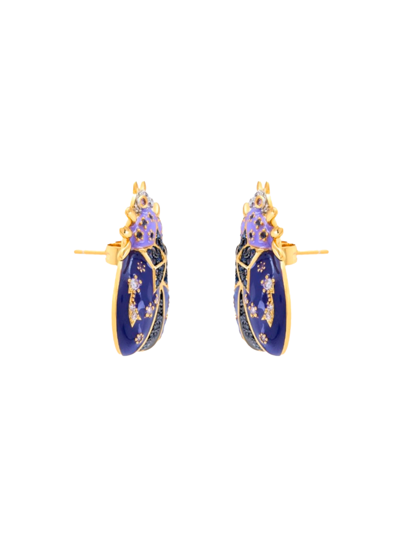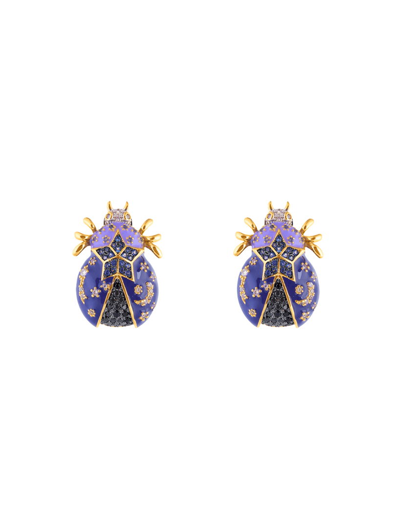 Made of bronze metal and 925 sterling silver pins, with 18 karat gold plating, black rhodium plating, and zirconia inlay, with select enamel details.