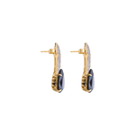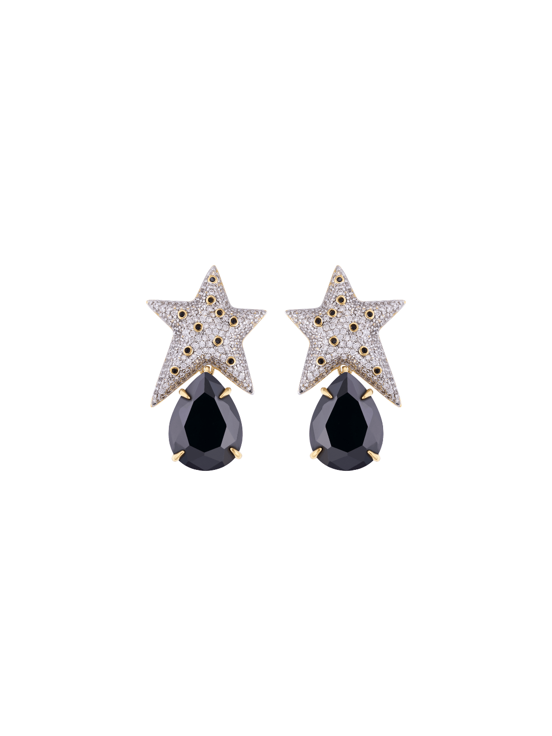 Crafted in bronze metal with 18 karat gold plating and white rhodium, this star shaped earrings reflect the radiance of a starry night with its crystal and onyx microcrystal inlays, complemented with a teardrop shaped onyx crystal. 925 sterling silver pins and posts.