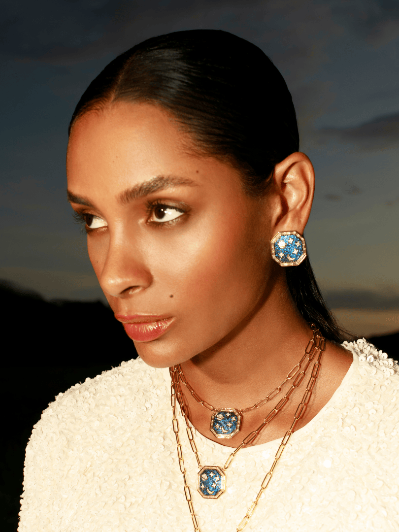 Our jewelry is made from silver and bronze, coated in 18k gold and rhodium, and adorned with natural stones, crystals, and select enamels.