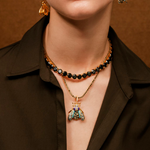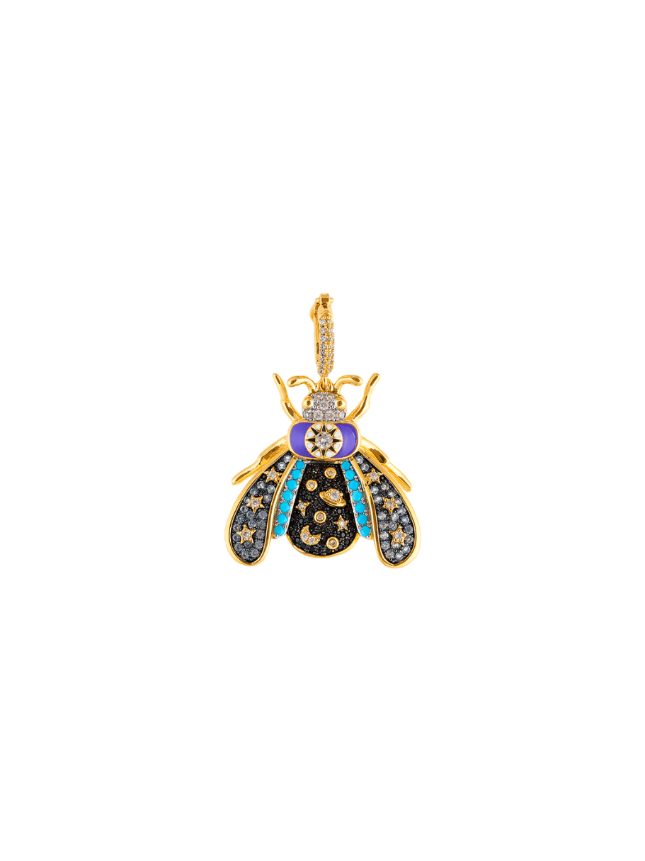 The Vespa Happi Pendant captures the depth of the cosmos and the life of the Nile River. Made of bronze with 18K gold plating, white rhodium, and black rhodium, and adorned with microcrystals in aqua, crystal, and onyx tones. Finished with enamel in purple, turquoise, and white.
