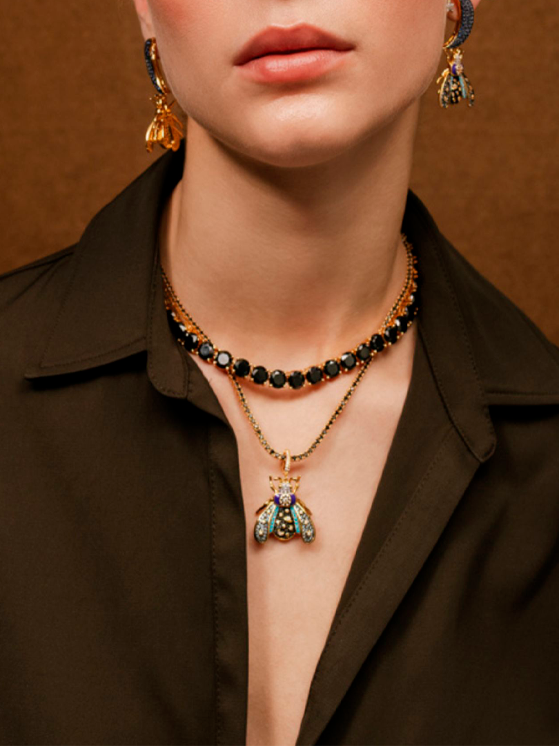 Our jewelry is made from silver and bronze, coated in 18k gold and rhodium, and adorned with natural stones, crystals, and select enamels.