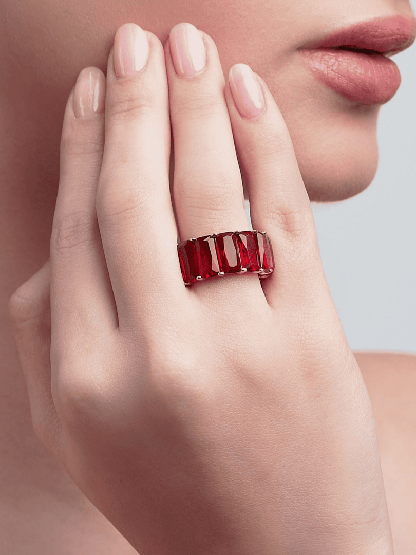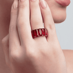 Anillo elaborado en plata ley 900 y bronce con baño de oro de 24k e incrustación de cristales color rubí intenso.