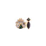 Crafted in bronze with 18k gold plating, white rhodium plating, and black rhodium plating. Features baguette-cut crystals, microcrystals in clear and black tones, a faceted blue teardrop crystal, and a gray crystal rhombus.