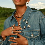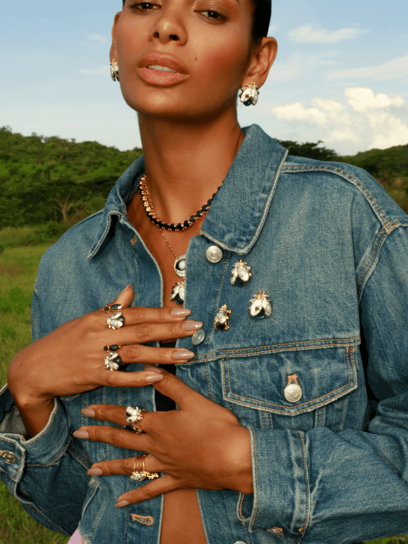 Our jewelry is made from silver and bronze, coated in 18k gold and rhodium, and adorned with natural stones, crystals, and select enamels.
