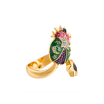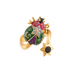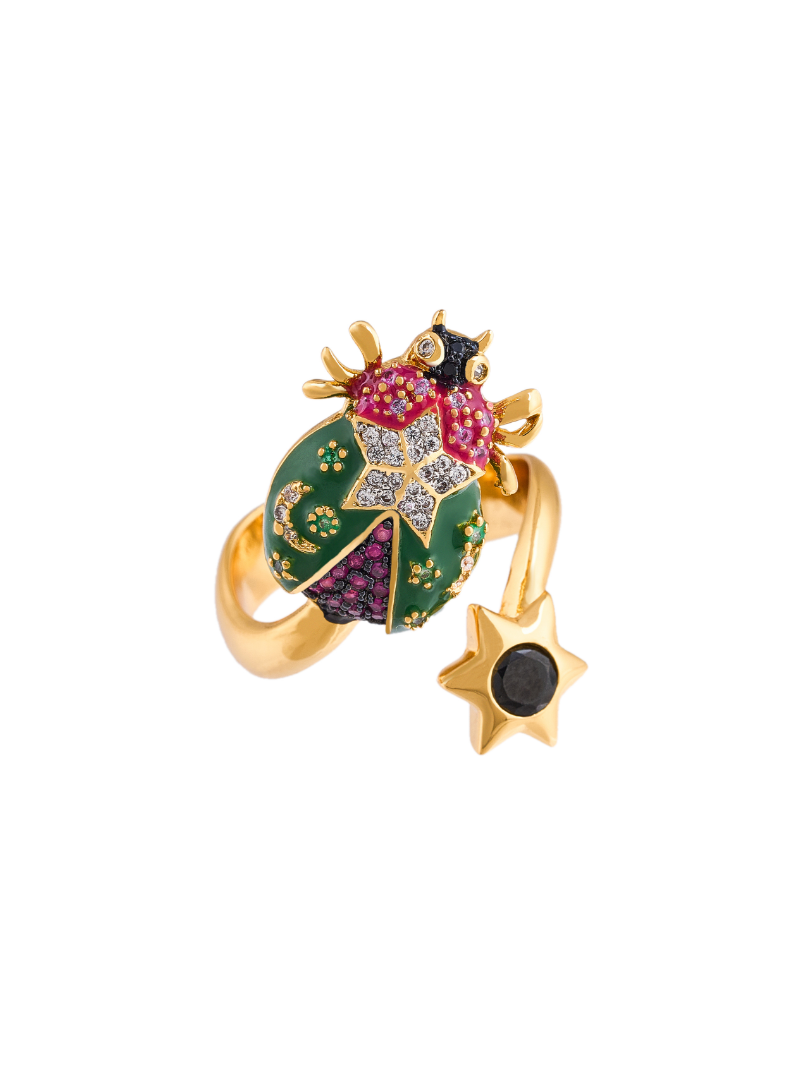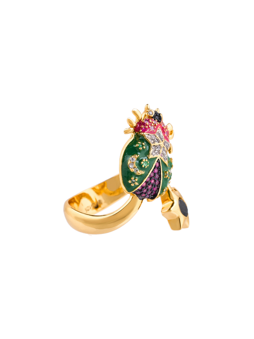 A jewel that connects with the serenity of the cosmos and the magic of nature. The Thea Burgundy Ring combines the brilliance of 18K gold plating with the enigmatic glow of white and black rhodium. Its cubic zirconia in crystal, onyx, amethyst, and ruby shades are detailed with burgundy and moss green enamel, perfect for those seeking to stand out with divine elegance. Crafted in bronze with 18K gold plating, black rhodium, white rhodium, cubic zirconia, and select enamel details.