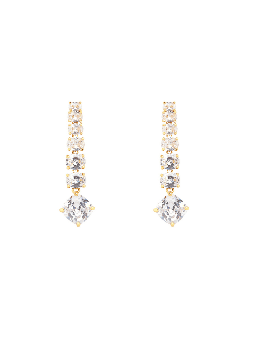 Aretes elaborados en metal bronce con baño de oro de 18K con incrustación de cristales color cristal.
