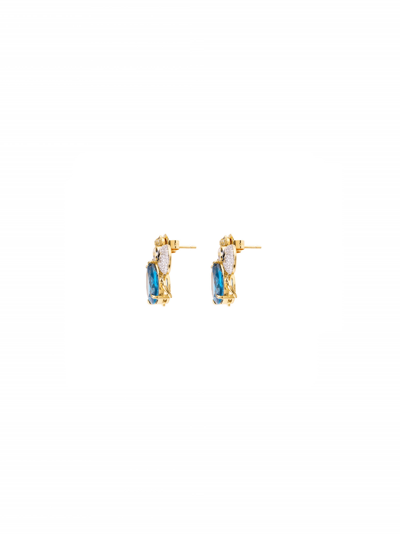 Crafted in bronze with 18k gold plating, white and black rhodium plating, featuring a faceted aqua crystal marking the body. Embellished with inlays of yellow topaz, crystal, black, and ruby microcrystals, with white and black enamel techniques on the wings, eyes, and head.