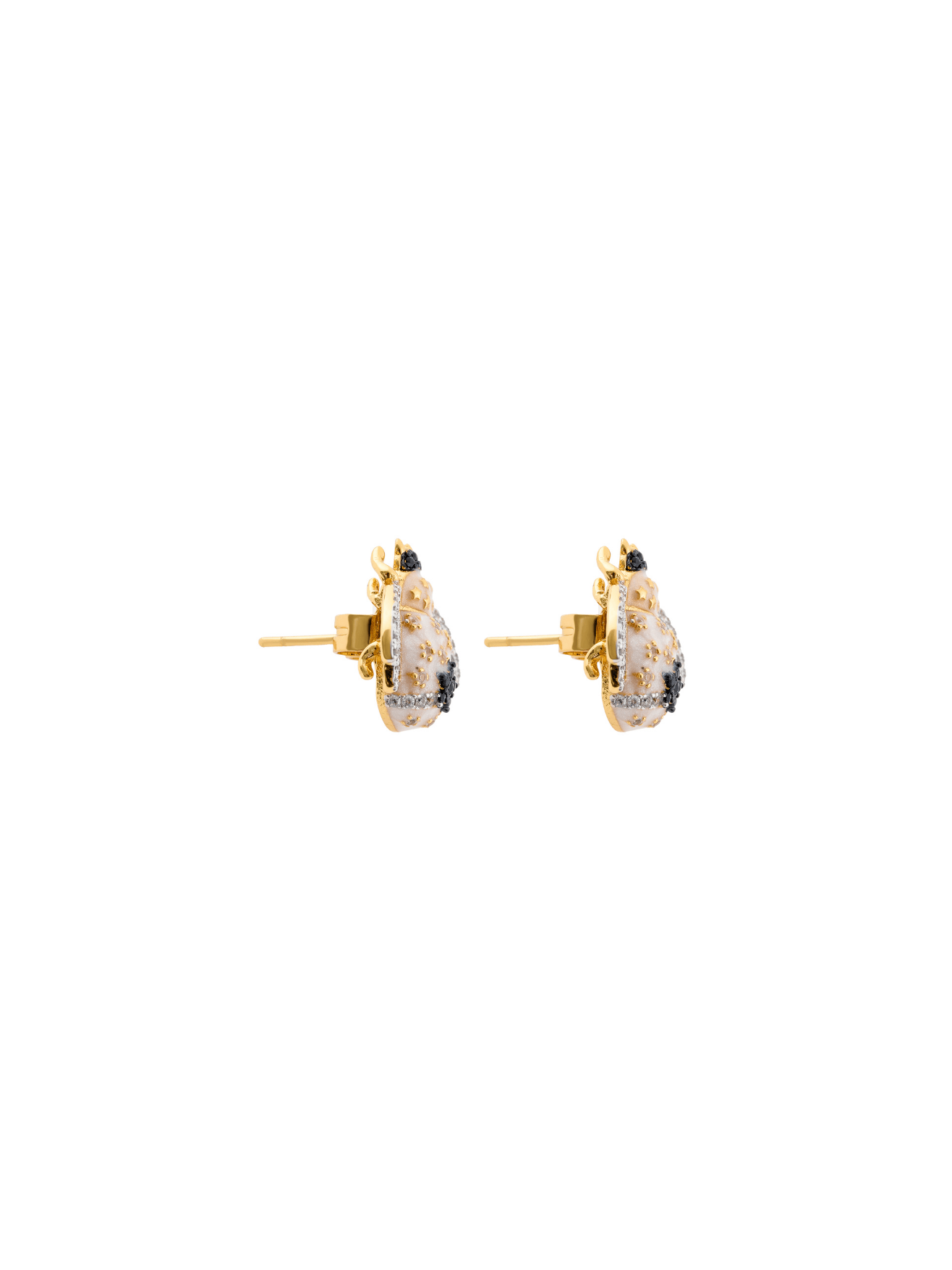 A world where elegance and vitality intertwine, the Ibis Nacar stud are a tribute to nature transformed into art. Carefully crafted in bronze metal with 18 karat gold plating, white rhodium and black rhodium, these moles shine with the charm of their silver, black, crystal and gold zircons, complemented by pearl colored enamel technique.