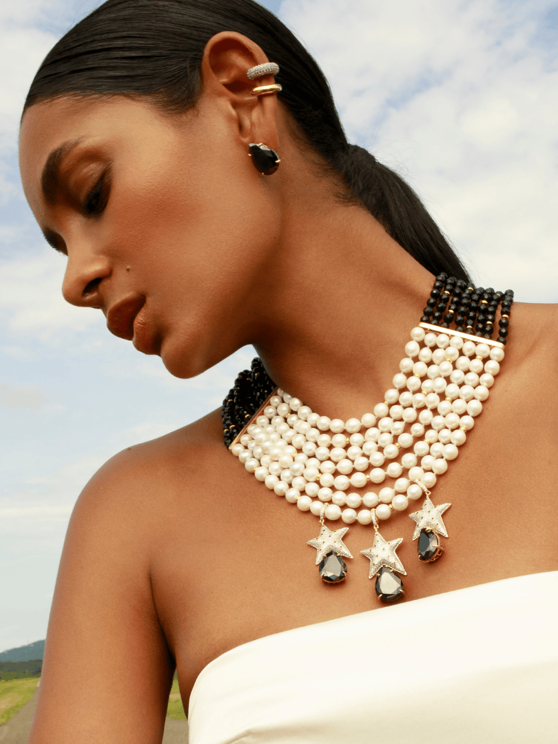 Our jewelry is made from silver and bronze, coated in 18k gold and rhodium, and adorned with natural stones, crystals, and select enamels.