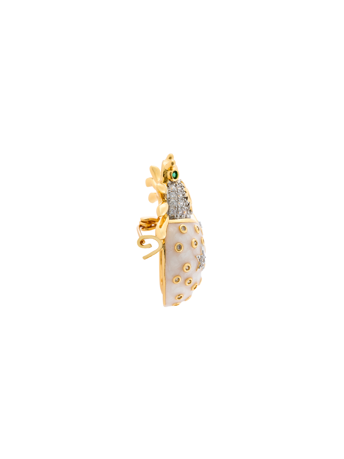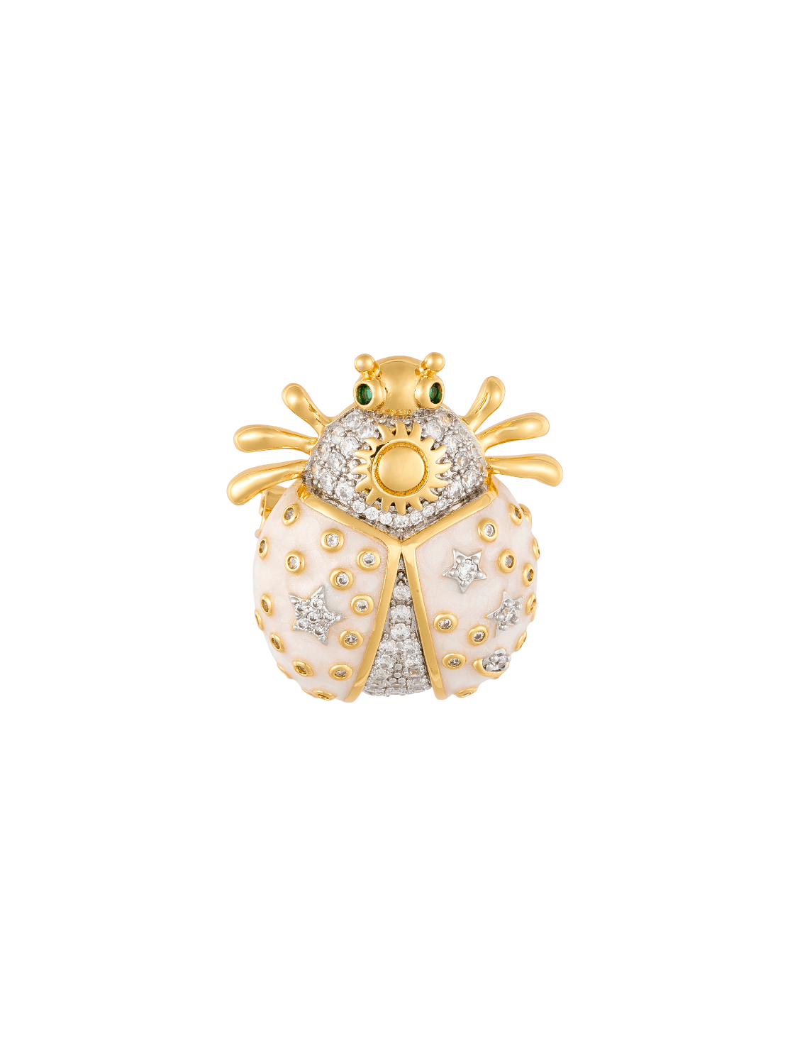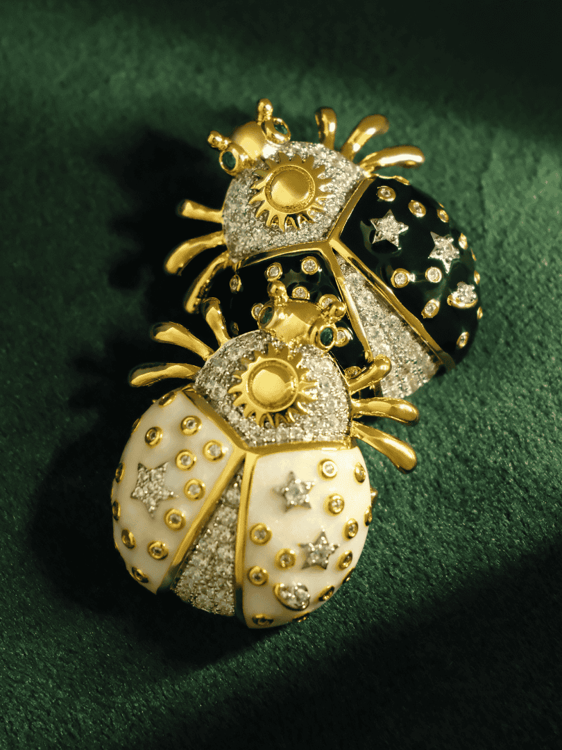 Crafted in bronze metal, 18 karat gold plated, white rhodium plated, and zircon inlay, with select enamel accents.
