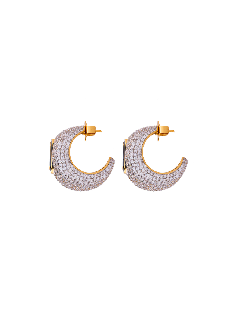 Crafted in bronze plated with 18k gold and white rhodium, and adorned with a faceted aqua toned crystal framed by clear microcrystals and black enamel. 925 sterling silver pins and posts.