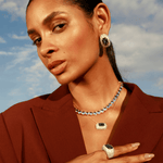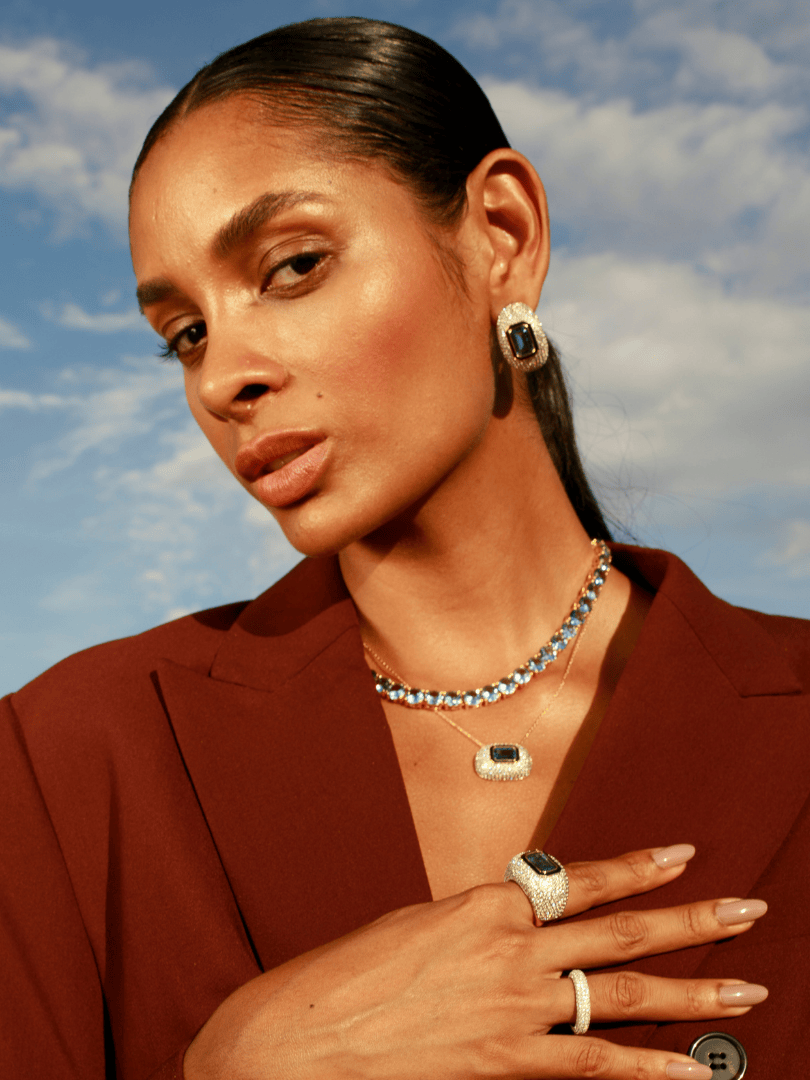 Our jewelry is made from silver and bronze, coated in 18k gold and rhodium, and adorned with natural stones, crystals, and select enamels.