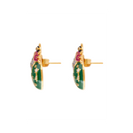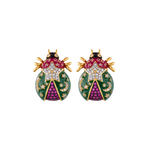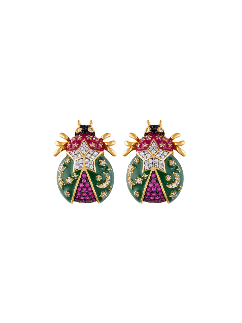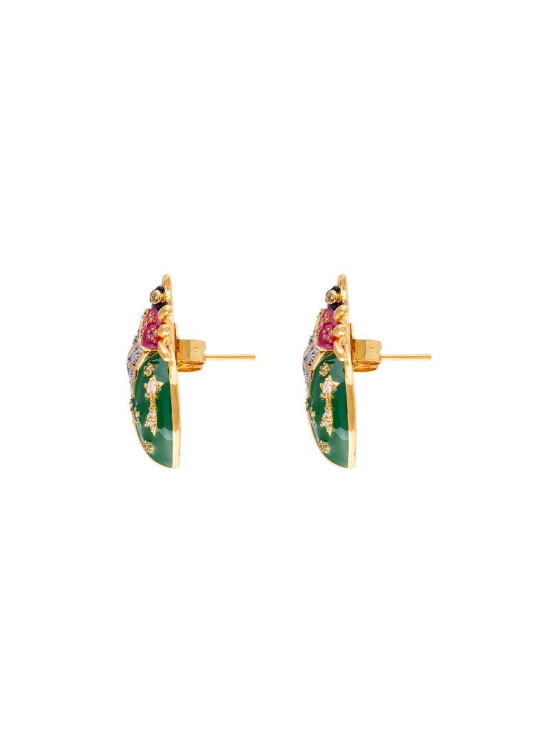 This design fuses the brilliance of 18K gold plating with the mystery of white and black rhodium. Features cubic zirconia in crystal, black, lilac, and ruby tones, with delicate enamel details in burgundy and moss green. Made in bronze with 925 sterling silver posts.
