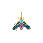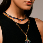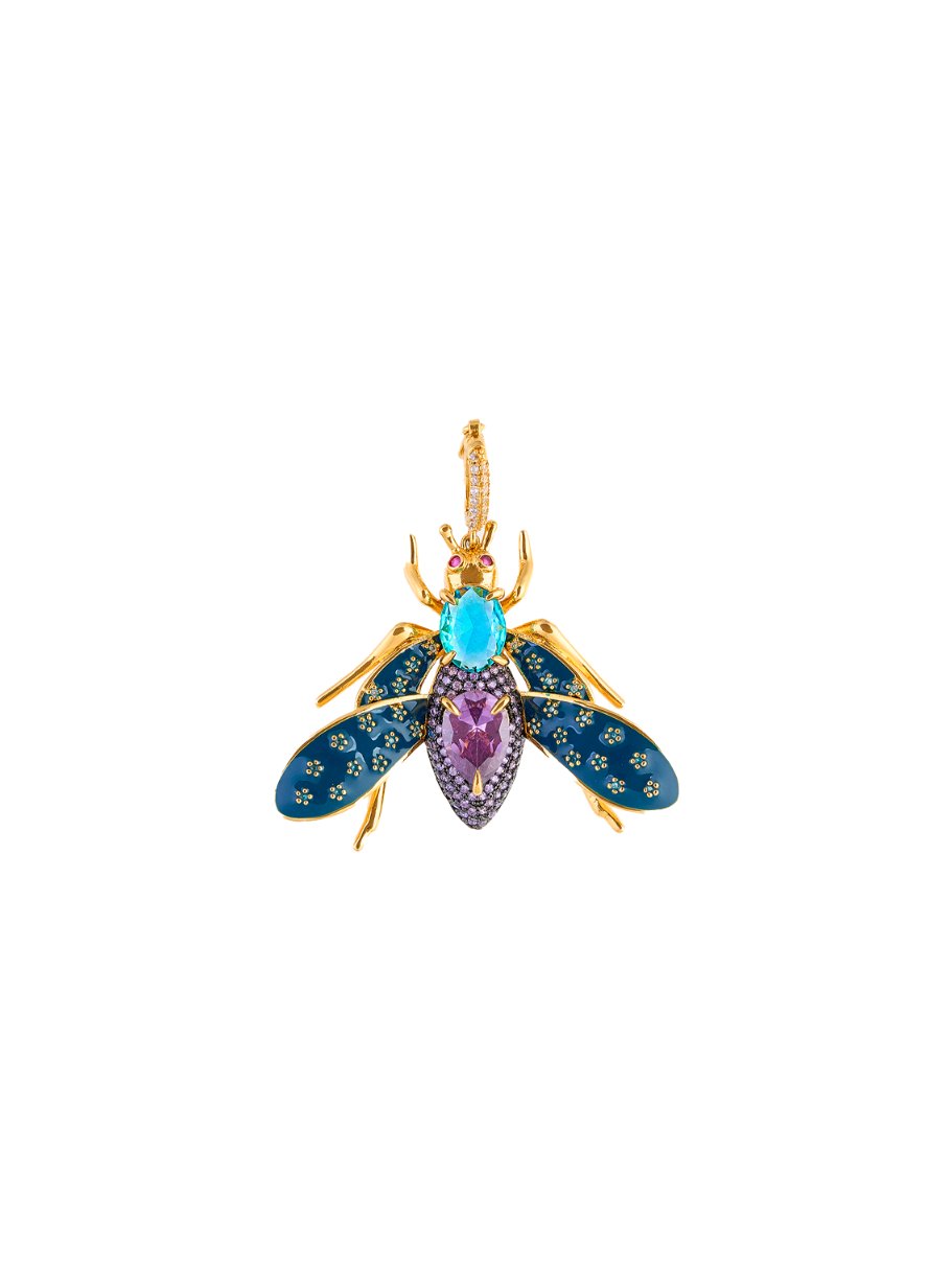 Inspired by the Egyptian solar deity Ra, this pendant radiates power and sophistication. Made of bronze with 18K gold plating and black rhodium, it features cubic zirconia in amethyst, aqua blue, crystal, and ruby tones, accented with petrol blue enamel for a touch of cosmic and earthly elegance.