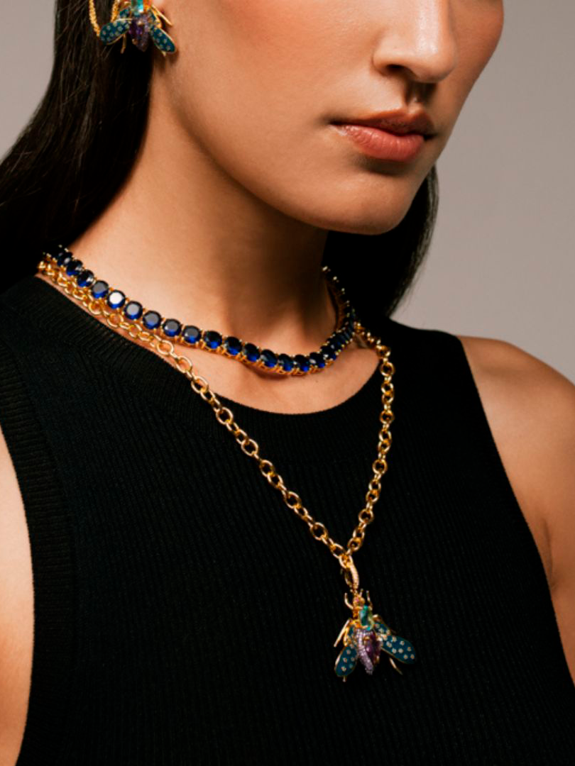 Our jewelry is made from silver and bronze, coated in 18k gold and rhodium, and adorned with natural stones, crystals, and select enamels.